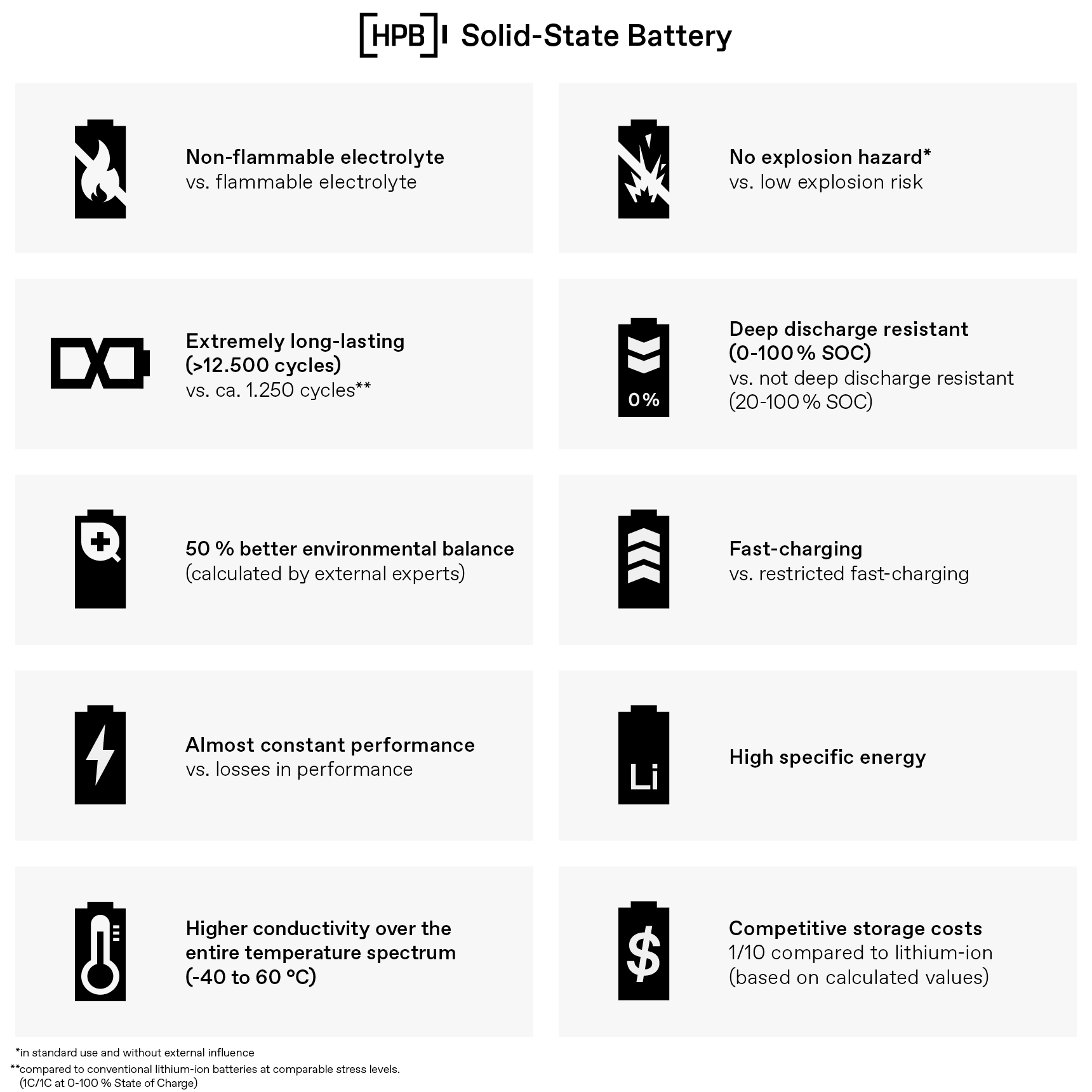 Conventional lithium-ion batteries are associated with a certain risk of fire and explosion, which impairs their acceptance (e.g. in the home storage sector) and limits their application potential. In contrast to conventional liquid organic electrolytes, the HPB Solid-State Electrolyte is not flammable. Therefore, not only does the HPB Solid-State Battery not pose a fire hazard, but it is also considerably less flammable than conventional lithium-ion batteries when exposed to an externally caused fire. Safety also includes potential harm to people and the environment if battery cells are damaged in an accident, for example. Significant advantages over conventional batteries can also be expected in this area.