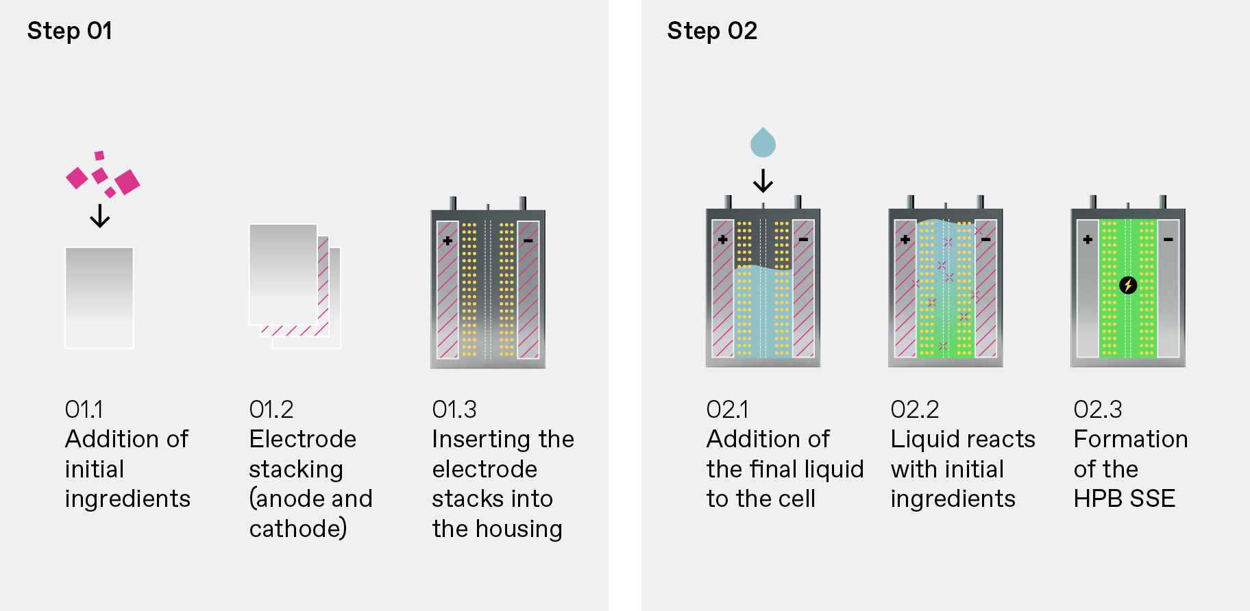 The production process of the HPB Solid-State Electrolyte (SSE) inside the battery cell is comparable to that of a two-component glue: The addition of a liquid facilitates a chemical reaction with the initial solid ingredients, resulting in the formation of the HPB Solid-State Electrolyte directly within the battery cell.