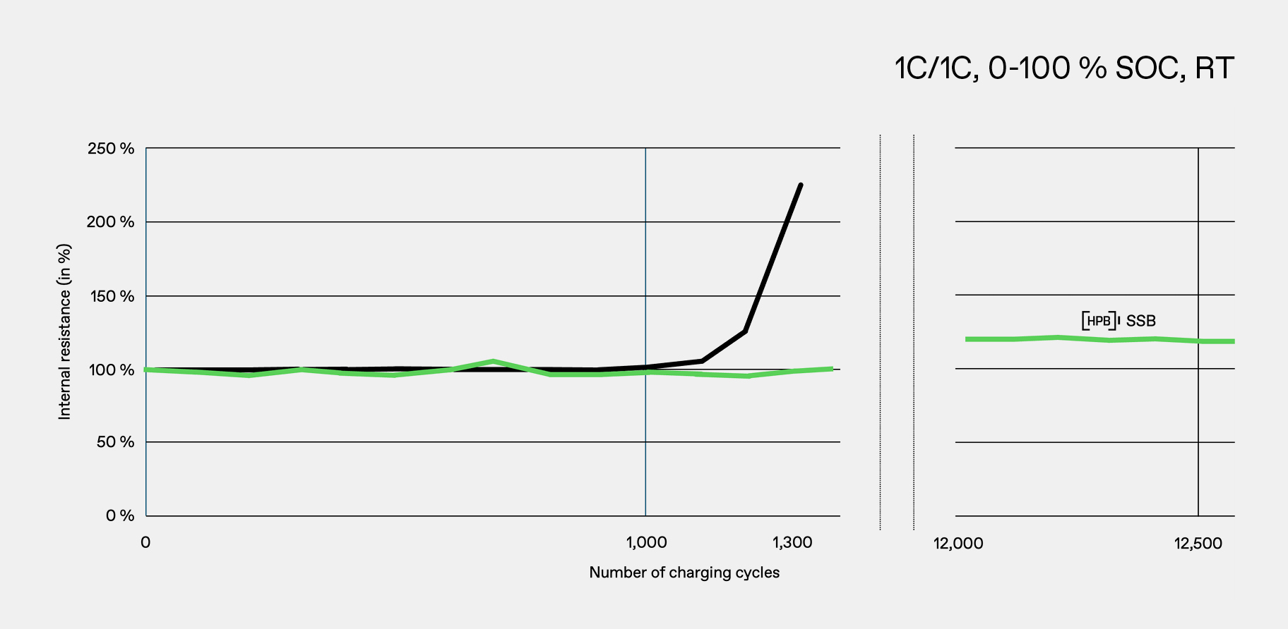 While conventional lithium-ion batteries have to be replaced after approx. 1,250 charging cycles*, with hourly charging and discharging, the HPB Solid-State Battery currently has at least 12,500 charging cycles, with a comparable load. Since these cycle life test cells have not yet reached the end of their life, this number will continue to increase steadily.