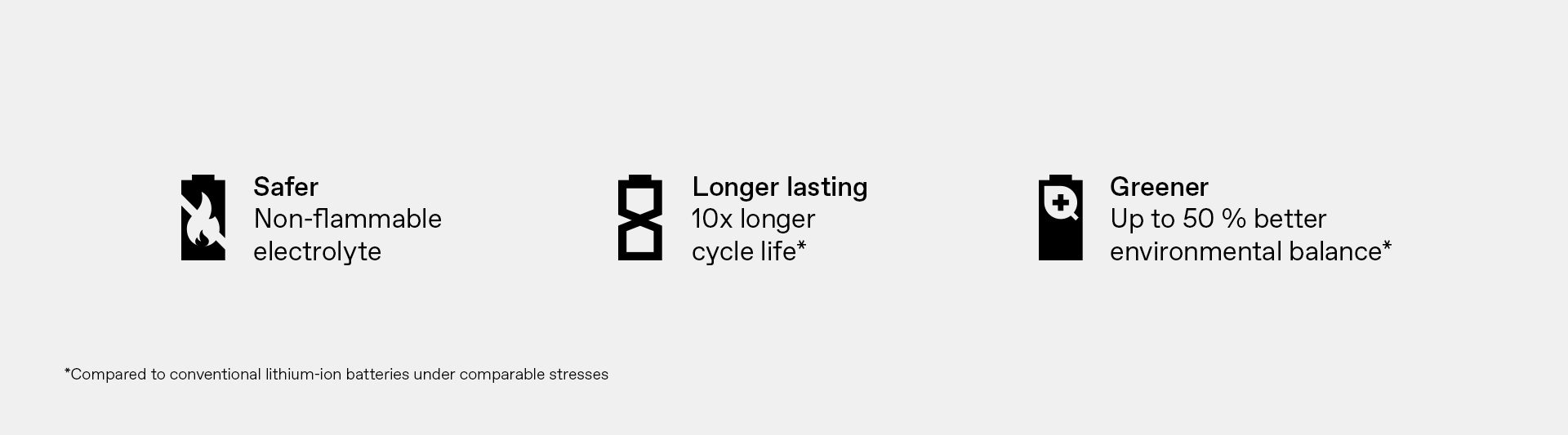 Conventional lithium-ion batteries are associated with a certain risk of fire and explosion, which impairs their acceptance (e.g. in the home storage sector) and limits their application potential. In contrast to conventional liquid organic electrolytes, the HPB Solid-State Electrolyte is not flammable. Therefore, not only does the HPB Solid-State Battery not pose a fire hazard, but it is also considerably less flammable than conventional lithium-ion batteries when exposed to an externally caused fire. Safety also includes potential harm to people and the environment if battery cells are damaged in an accident, for example. Significant advantages over conventional batteries can also be expected in this area.